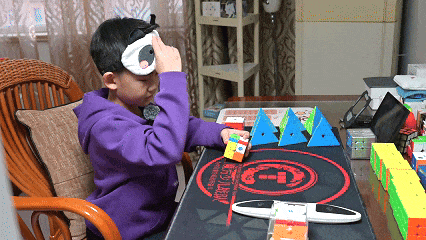 魔方是手、眼、脑的极限竞速,他却甘之如饴。从金字塔、二阶到三阶、枫叶、斜转、镜面魔方,挑战列表不断拉长。更让人惊叹的是,他现在掌握了“盲拧”——双眼被遮,全凭记忆与空间想象,在寂静中复原魔方。那副屏气凝神的样子,俨然已是赛场上的“小将军”。